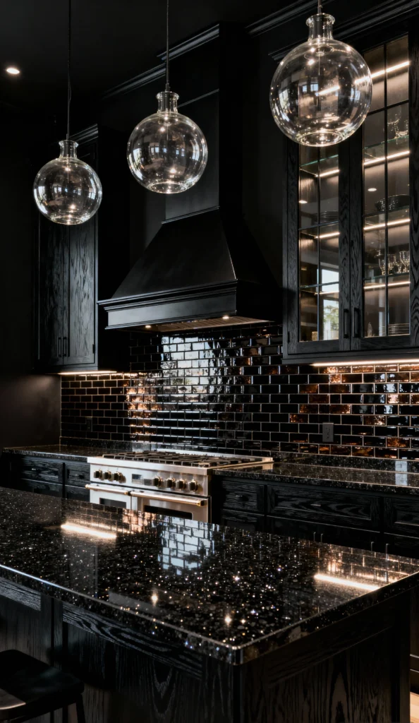 This is luxury dialled up to eleven. The deep, almost black, shiny subway tile backsplash reflects the light beautifully, adding incredible texture. But let’s talk about that countertop—it looks like a night sky full of glitter! The massive glass pendant lights are the perfect choice, casting a gorgeous glow over the whole space. This kitchen proves that an all-black palette can be anything but boring, especially when you play with reflective surfaces and different finishes. So chic!