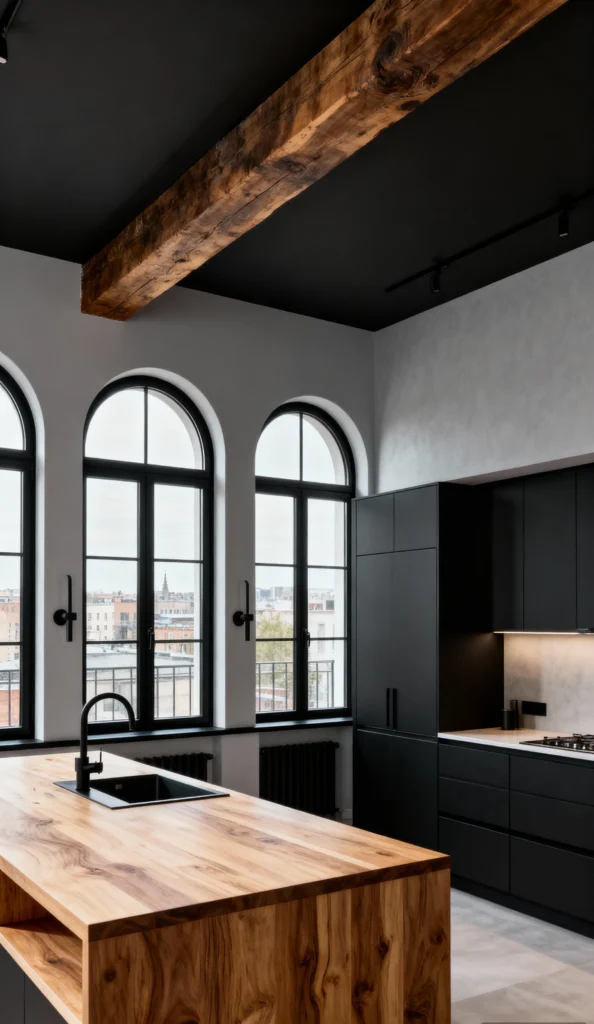 I am obsessed with the architectural features here! Those tall, arched windows with black frames are absolutely breathtaking and flood the modern, black-and-white space with light. The exposed, raw wood ceiling beam adds a wonderful rustic element against the stark black ceiling and cabinetry, giving the kitchen a cool industrial loft feel. The large wood island acts as the central gathering spot. It’s a perfect example of how black can enhance, not diminish, a bright, airy space.