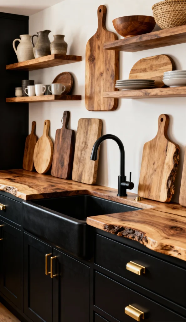 This kitchen is giving me serious cozy vibes! It’s all about natural materials here. The classic black base cabinets are perfectly contrasted by the super thick, live-edge wood countertops, which look incredibly durable and beautiful. The floating wood shelves above are styled beautifully with mismatched ceramic jugs and cutting boards, adding to the rustic charm. The gold hardware provides a subtle, elevated touch. This design feels organic, functional, and totally stylish—perfect for the home chef!