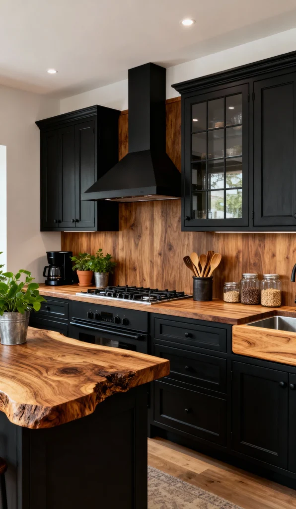Now this is a kitchen that feels instantly inviting! The classic black cabinetry is warmed up in a major way by the continuous, stunning wood backsplash and the live-edge butcher block countertops. The wood grain is absolutely gorgeous and adds a rustic, organic touch to the traditional cabinet style. The matte black range hood ties the look together, while the plants add a necessary pop of freshness. It’s the perfect blend of farmhouse warmth and modern sophistication.