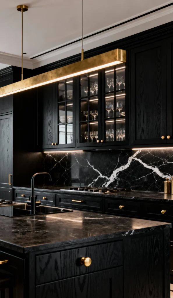 The dark, almost-black wood grain on the cabinetry provides a rich texture, but the black marble backsplash with the dramatic white veining steals the show. The choice of hardware—small, elegant brass knobs—is perfect. And that lighting fixture? The long, glowing brass strip above the island and upper cabinets is pure sophistication, bathing the glassware in a warm, inviting light. This is a masterclass in mixing textures and adding metallic luxury!