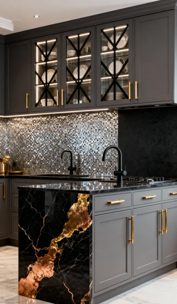 This is such a glamorous take on the dark kitchen trend! The sleek gray shaker cabinets are the perfect backdrop for those bold gold handles and the unbelievably sparkly, metallic mosaic tile backsplash. But the real star? That island panel wrapped in black marble with the striking copper veining! It’s an absolute masterpiece and a total focal point. The lit-up glass upper cabinets with the crisscross mullions add a touch of classic elegance. Love the combination of modern texture and traditional cabinet style.