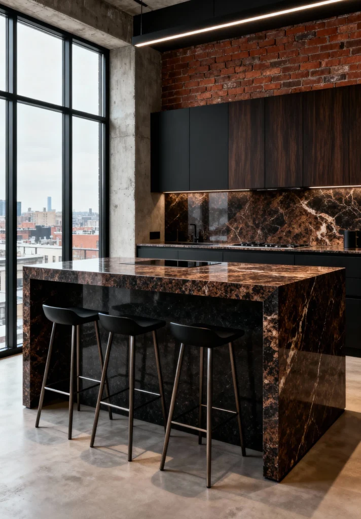 This space is pure industrial chic! The mix of materials is what makes this kitchen truly captivating: exposed brick, raw concrete, and then BAM—that incredible waterfall island in rich, veined marble. The black upper cabinets pair perfectly with the dark wood grain beneath them, grounding the whole design. Plus, that floor-to-ceiling window lets in so much light, balancing out the dark palette. It’s a fabulous example of how to make a large loft space feel warm and sophisticated.