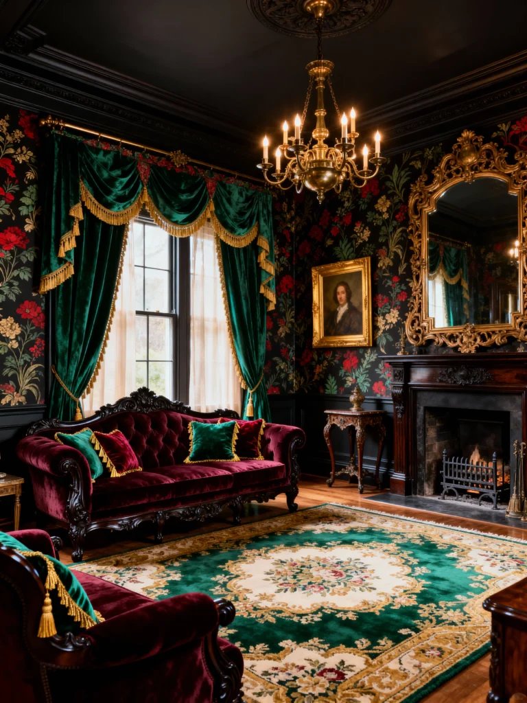 This room is a masterclass in using color within a dark setting. Forget plain black walls—here we have stunning dark floral wallpaper featuring rich reds and greens, which immediately gives the room a vibrant, yet sophisticated feel. The jewel-toned palette continues with the maroon velvet sofa and the deep emerald green velvet curtains (check out that gorgeous gold trim!). The large, ornate gold mirror and the brass chandelier add a classical, luxurious sparkle. The green and gold rug perfectly pulls all those colors together, grounding the space. It’s gothic, but with a wonderfully lively, botanical energy!