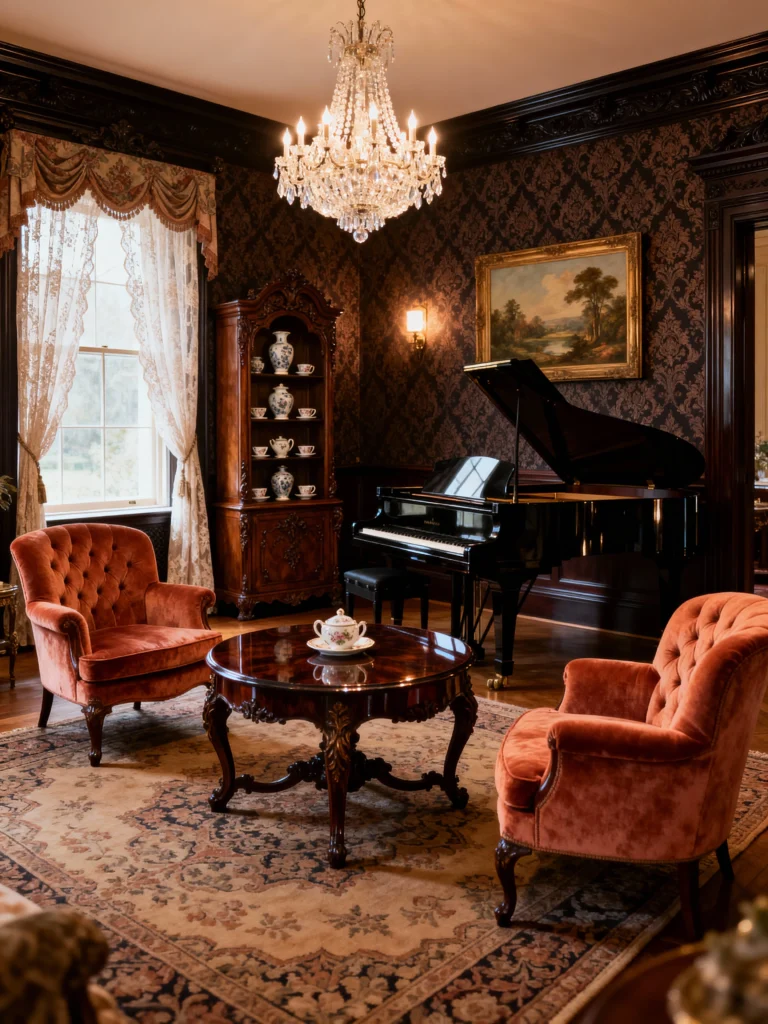 This room, captured takes the dark aesthetic and softens it up a bit with warmer tones and softer light. It’s the perfect example of how to incorporate gothic elements without going full-on haunted house! The black baby grand piano immediately gives the room a sophisticated, refined atmosphere—definitely a room for enjoying music or quiet contemplation. While the walls are dark, the chairs are upholstered in a beautiful burnt orange/terracotta velvet, and the rug is a soft, muted pattern, balancing the heavier elements like the dark wood hutch and the black window trim. It still has that sense of historic grandeur, especially with that magnificent crystal chandelier, but the lighter upholstery makes it feel approachable and bright.