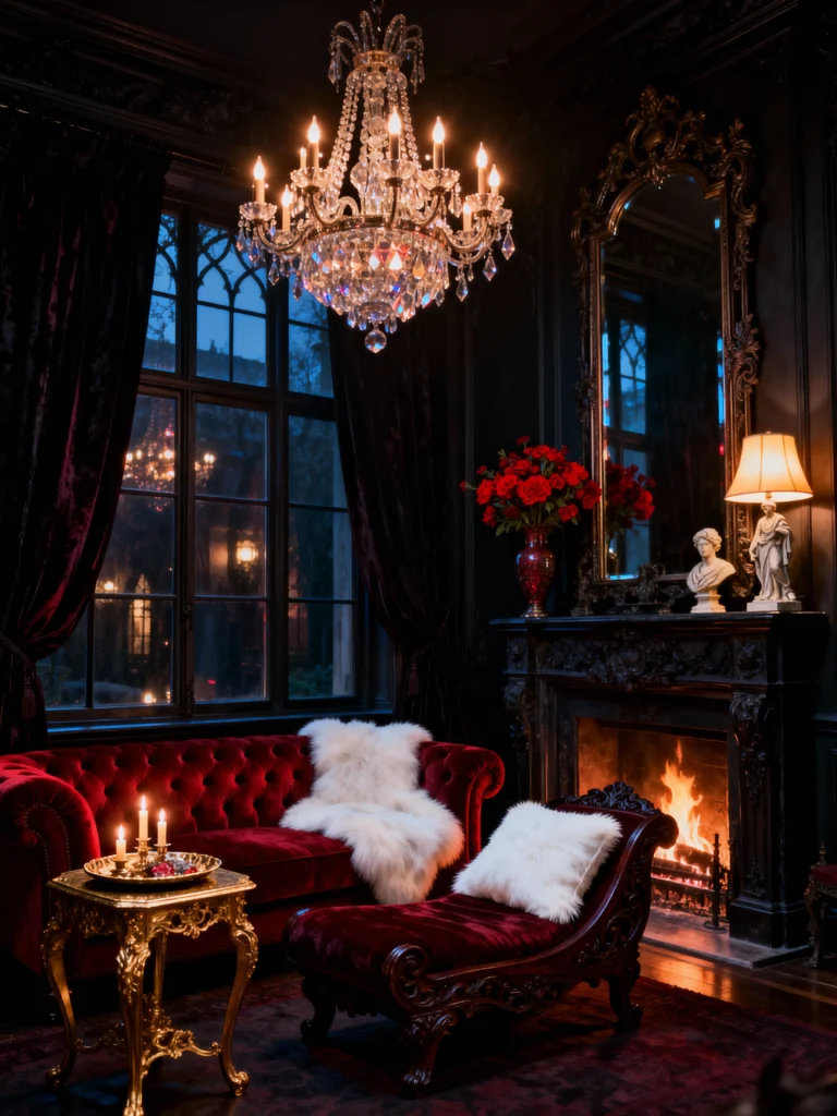 This space is all about intimate, luxurious comfort. The dark, panelled walls create a snug backdrop, while the rich maroon velvet chaise lounge and sofa are absolutely begging you to recline on them. This room uses light in a wonderful way—the warm glow from the crystal chandelier and the table lamp, coupled with the crackling fire, creates a soft, inviting ambiance. The brass and gold accents (like the ornate mirror and the small side table) are key here, adding a regal, gilded touch that prevents the dark colors from feeling overwhelming. And who could resist those fluffy white throws? It just looks like the perfect place to spend a chilly evening!