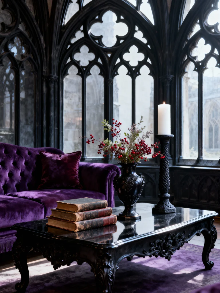 Wow, talk about a showstopper window! the massive, intricate window with its pointed arches (like you’d find in a stunning cathedral!) is what defines this space. The furniture takes a cue from the grand architecture by being equally bold. We’ve moved from red to a rich, stunning purple velvet on the sofa. This color choice, often associated with royalty, adds a truly unique twist to the dark aesthetic. The black, heavily carved coffee table and the simple, tall candle stand reinforce the dark mood, but the light streaming in ensures the space remains vibrant. The small pop of color from the berry arrangement adds a beautiful, organic touch to this sophisticated, jewel-toned room.