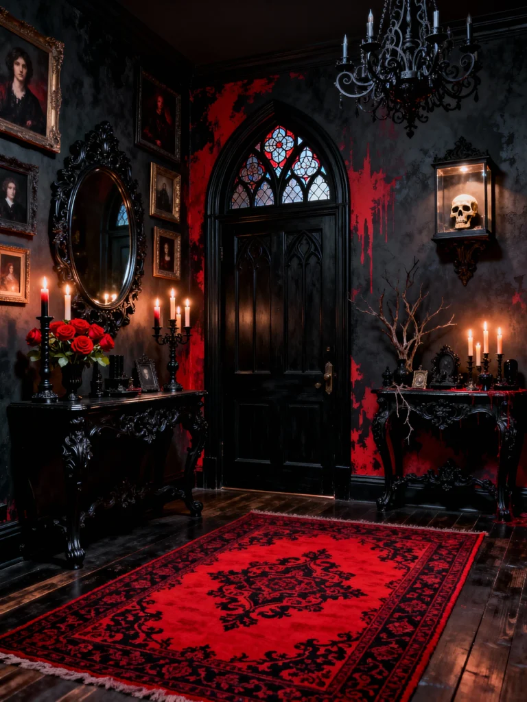Okay, so this one is pure, unfiltered drama! this foyer screams “Enter if you dare.” The black-on-black furniture, the gothic archway door with stained glass, and that striking black chandelier set an incredibly moody stage. But the real showstopper? The red, dripping paint effect on the walls—it’s a bold, almost rebellious take on a classic dark aesthetic. Notice how the single red rug anchors the space, mirroring the wall’s color. And did you spot the skull in the display case? It’s a cheeky nod to classic gothic macabre. This room proves that you don’t have to be subtle to be sophisticated; sometimes, you just need a lot of black velvet and a little bit of horror vacui love!