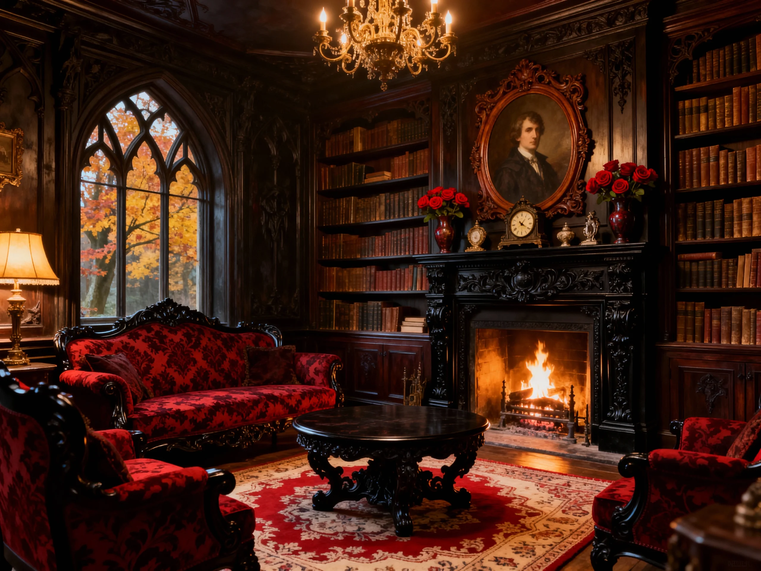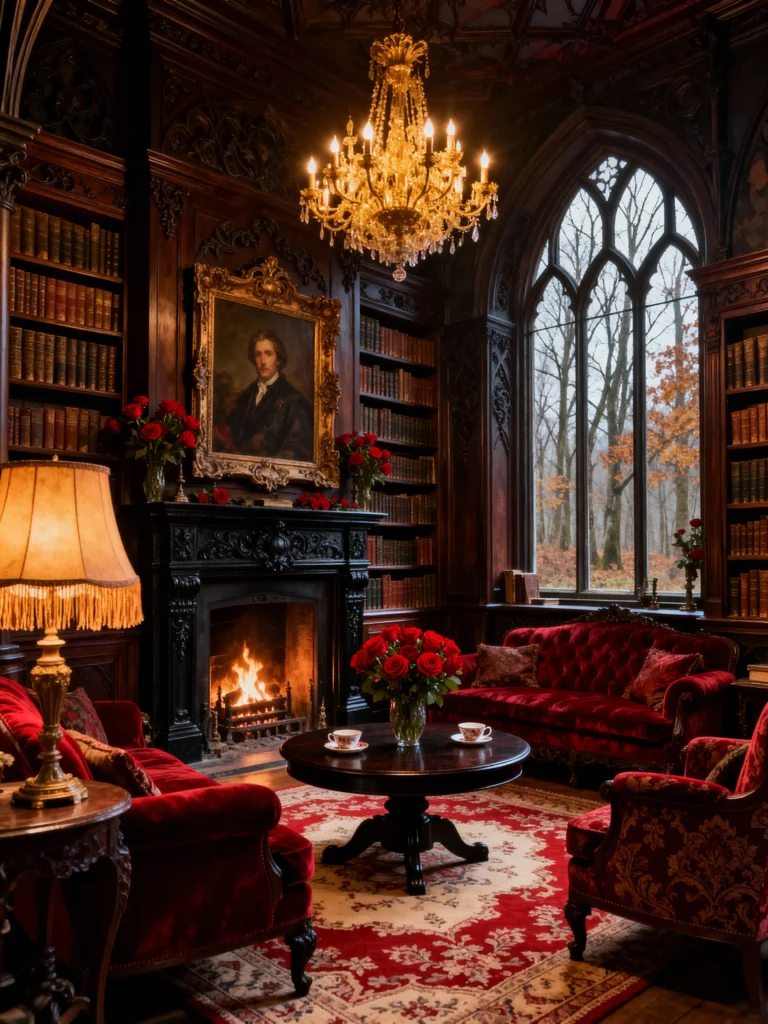 This is the essence of a stately, traditional manor. It shares that lovely warmth and luxury with the previous image, but this one feels a touch more formal. The dark mahogany paneling and the intricate fireplace are stunning, and the symmetry is spot-on, which adds to the formal feel. The matching red velvet armchairs and sofa are gorgeous, but look closer at those heavy, custom-made red velvet curtains with the delicate lace trim—they just ooze vintage elegance. The crystal chandelier adds a refined sparkle, contrasting with the warm glow of the candles and the fire. It’s all about layering those rich textures and classic art for an unforgettable space.