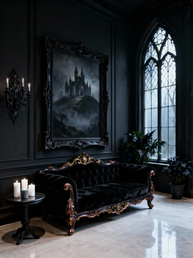 This room takes the gothic style and strips it down to its most elegant essentials. It’s almost minimalist in its approach! The walls are a smooth, matte black, accented by simple, refined paneling. The focal point is, of course, the stunning black velvet sofa with subtle gold detailing—it’s classic in shape but modern in its deep, monochrome hue. The oversized painting of the misty castle truly captures the romantic, mysterious essence of the gothic aesthetic. Instead of heavy curtains, the enormous arched, traceried window is left to speak for itself, letting in that wonderful natural light. It’s a gorgeous example of sophisticated darkness without too much clutter.