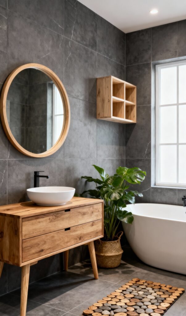 The dark gray, large-format tiled walls and floor provide a strong, contemporary, and grounded feel. This severity is beautifully broken up by the bright wooden vanity and floating shelf. The round mirror and the pop of green from the large plant soften the edges, creating a stylish and balanced urban retreat.