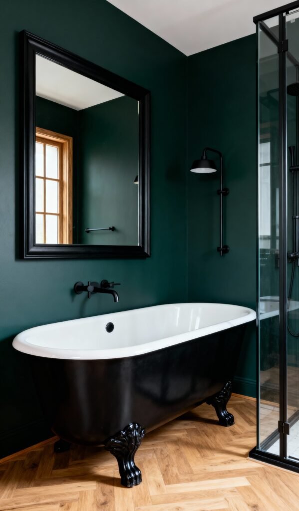 If you want to make a statement, this is how you do it! The deep, moody, forest green walls are incredibly rich and luxurious. The bold use of black—on the clawfoot tub, the large mirror frame, and the fixtures—creates a sharp, stylish contrast. It’s a fantastic modern take on a classic look, showing how dark colors can feel cozy, not closed-in, especially with that warm wooden floor.