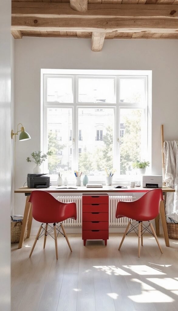 the flood of natural light makes this dual workspace incredibly appealing. The classic Scandinavian desk and light wood floors create a serene, airy base. But the brilliant pop of red in the chairs and central drawers adds playful energy. It’s a beautiful, symmetrical setup that’s ideal for a couple working side-by-side.