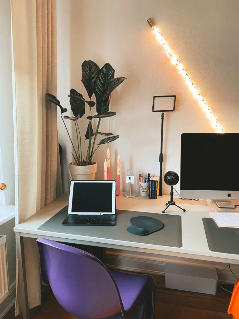 The diagonal light tube adds a unique, atmospheric glow, and the ring light is prepped for the camera. The dark green plant contrasts beautifully with the unexpected pop of purple in the chair. It’s a modern, high-energy space that proves you can mix bold colors and still maintain a clean desk surface.