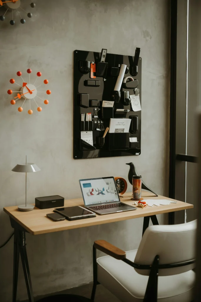 Offers a sophisticated, industrial-chic look. The concrete wall texture and mid-century clock provide a cool, refined backdrop. The black organizer board is a brilliant solution for keeping essentials within reach while maintaining a minimal aesthetic. The sleek laptop, modern lamp, and unique black bird sculpture make this feel like the desk of a designer or architect.