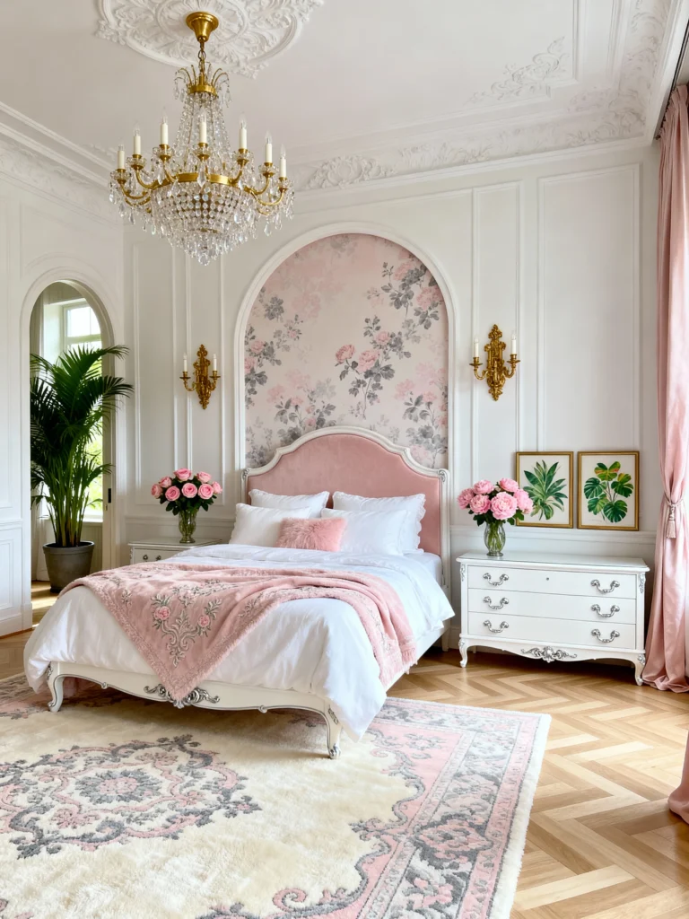 If you want to wake up feeling like you’re in a boutique hotel in Paris, this is it. The star of the show is that gorgeous arched floral wallpaper behind the bed. It’s such a clever way to add a “wow” factor without overwhelming the whole room. I love how the white French-style furniture keeps things light and airy, while the crystal chandelier adds just the right amount of sparkle. It’s soft, feminine, and totally timeless.