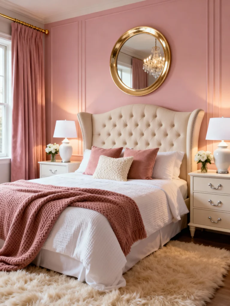This room uses a beautiful mauve-pink on the walls that feels grown-up and calming. The oversized gold porthole mirror is a great focal point, and the chunky knit pink throw ties the whole color palette together. It’s a very “approachable” luxury—it looks high-end but still feels like a place where you can actually kick off your shoes and relax.