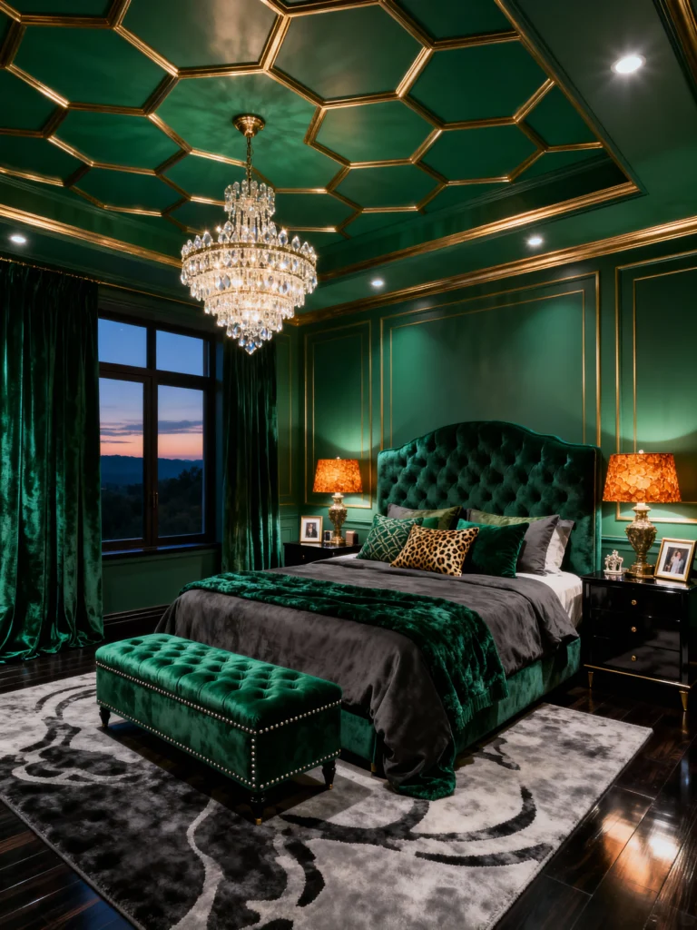 Okay, can we talk about this ceiling? The gold hexagonal pattern on that deep green is absolutely genius. This room is for the person who isn’t afraid of a little drama. The velvet headboard and matching bench feel so luxurious, and the gold accents make the whole space glow. It’s moody, sophisticated, and looks like the perfect place to retreat after a long day.