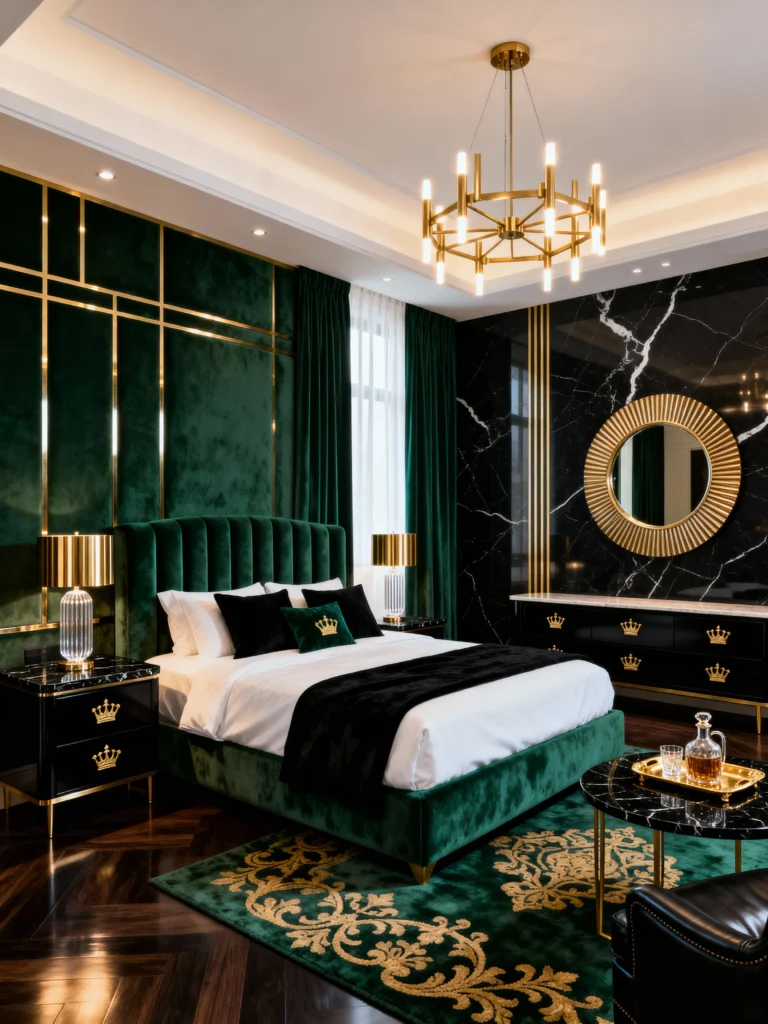 This room screams “luxury.” I am obsessed with the black marble accent wall and that circular gold mirror—it looks like a piece of jewelry for your wall! The emerald green velvet bed with the gold crown details on the nightstands makes the space feel incredibly curated. If you love a look that is bold, structured, and high-fashion, this is your blueprint.