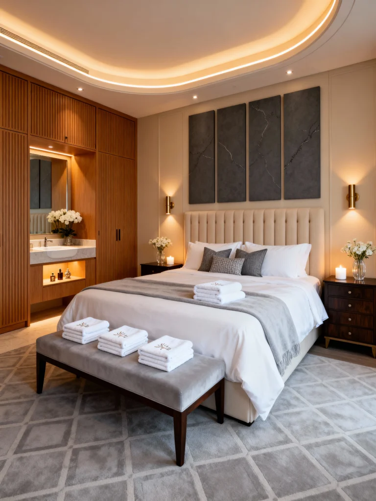 If your goal is total relaxation, look no further. This room feels like a high-end spa. The built-in wooden cabinetry with the integrated vanity is such a great space-saver. I love the neutral tones and the soft, indirect lighting from the ceiling. It’s clean, organized, and looks like the kind of room where you’d actually get a full eight hours of sleep.