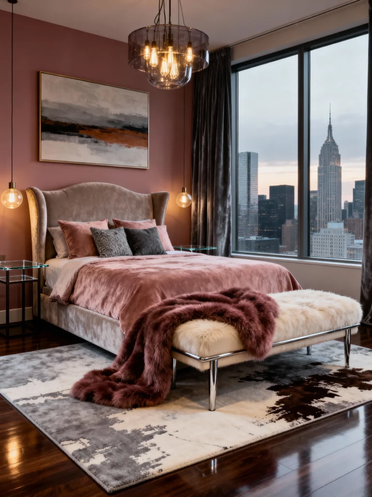 That view! This room perfectly balances a “cool city” vibe with cozy textures. The dusty rose velvet bed looks so inviting against the backdrop of the skyline. Using glass nightstands was a smart move here—it keeps the view unobstructed and the room feeling open. The faux fur throw adds that final touch of “cozy chic” that every city apartment needs.