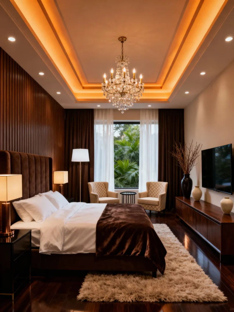 This room is like a warm hug. The vertical wood paneling adds so much height and texture to the space. I really like the symmetry here—the two matching armchairs by the window create a perfect little nook for morning coffee. The warm, layered lighting makes the dark browns feel rich rather than heavy. It’s masculine, cozy, and very high-end.