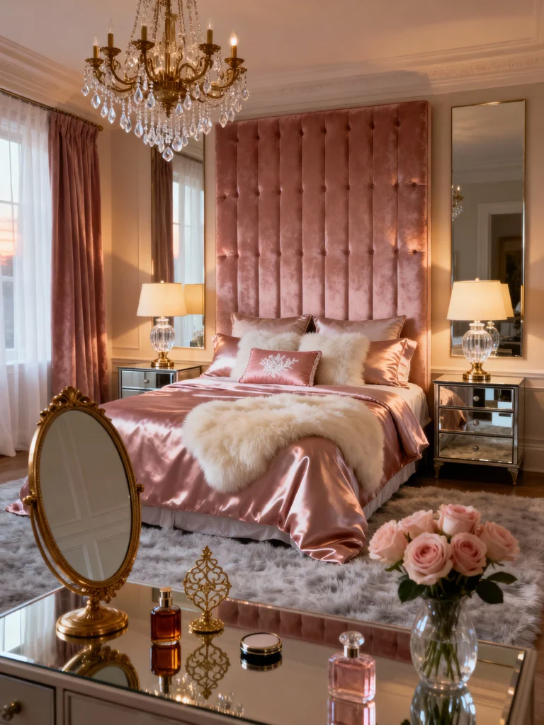This is pure glamour. That floor-to-ceiling tufted headboard is such a statement piece! Combined with the silk bedding and the mirrored nightstands, the whole room just shimmers. It feels very “Old Hollywood.” If you love things that sparkle and want your bedroom to feel like a literal palace, this satin-heavy look is the way to go.