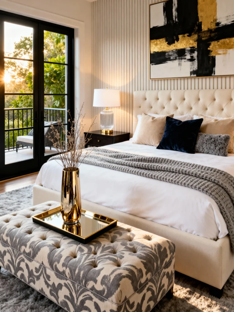 Proof that you don’t need bright colors to make a statement. This room is all about the “mix.” You’ve got the ribbed wall, the tufted headboard, the knit blanket, and the patterned bench. Because the colors are kept in the cream, tan, and black family, all those textures work together instead of clashing. It’s modern, sophisticated, and very “Pinterest-worthy.”