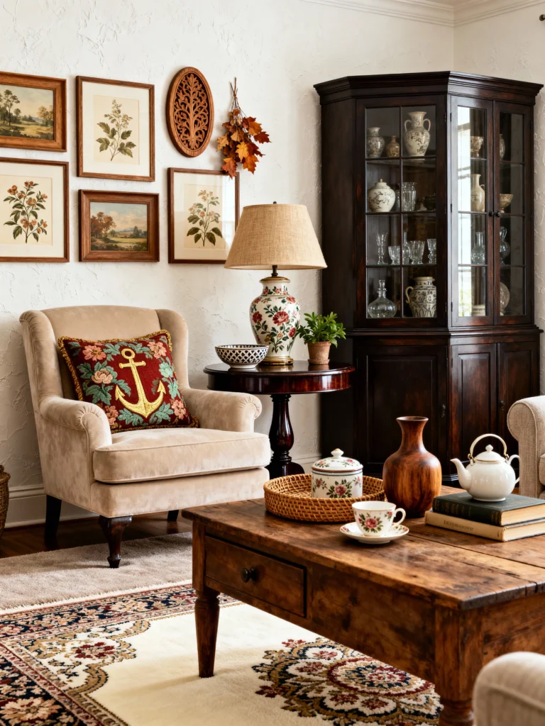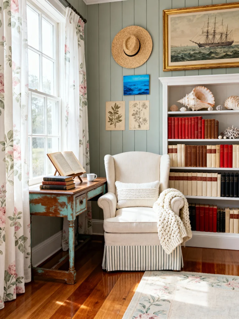 This corner is the definition of “layered.” I love how the creamy velvet wingback chair anchors the space, but that anchor-embroidered pillow is the real star—it adds such a fun, coastal personality without being cheesy. Look at the gallery wall; it’s a mix of botanical prints and landscapes that feel like they were collected over decades. Pro tip: notice the dark wood china cabinet in the back. It adds weight and “age” to the room, making it feel established and cozy rather than brand new. It’s the perfect spot to curl up with a cup of tea from that cute little set on the table.