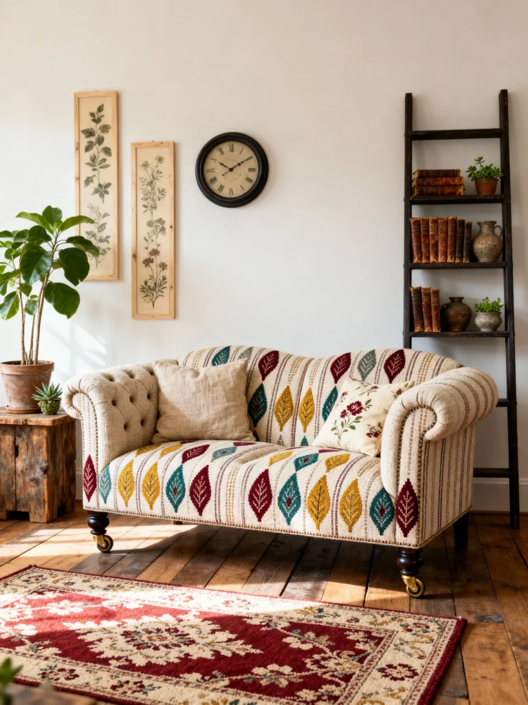Last but not least, let’s look at this amazing leaf-patterned sofa. English Country style loves a good pattern, and this one is so unique with its colorful, embroidered-look leaves. It’s the focal point of the room, so the walls are kept simple to let it shine. The leaning ladder shelf is a trendy but functional touch, holding vintage books and little potted succulents. It feels like a very modern take on the traditional cottage style—fun, eclectic, and super cozy.
