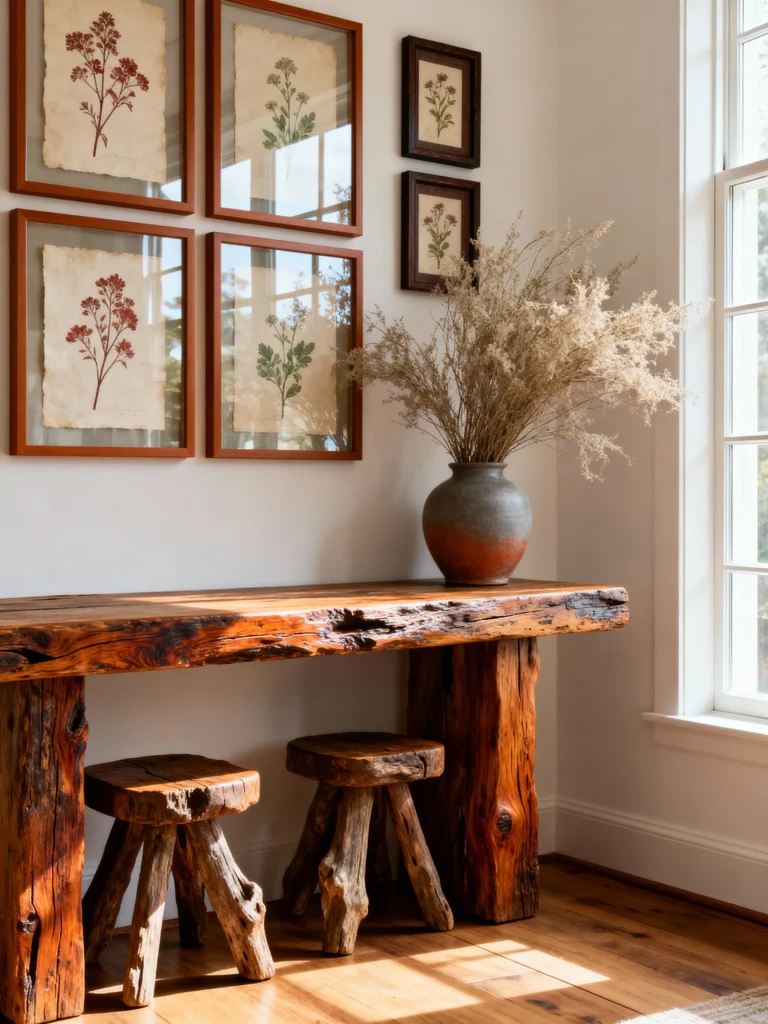Sometimes, the best decor is the kind that looks like it was found in the woods. This live-edge wooden console is a total showstopper. It’s rugged and chunky, which creates a cool contrast against the delicate, framed botanical sketches on the wall. Those little three-legged stools are so charming—they look like something out of a fairy tale. The dried florals in the oversized vase add height and texture without needing the maintenance of fresh flowers. It’s proof that a “natural” look can still feel very sophisticated.