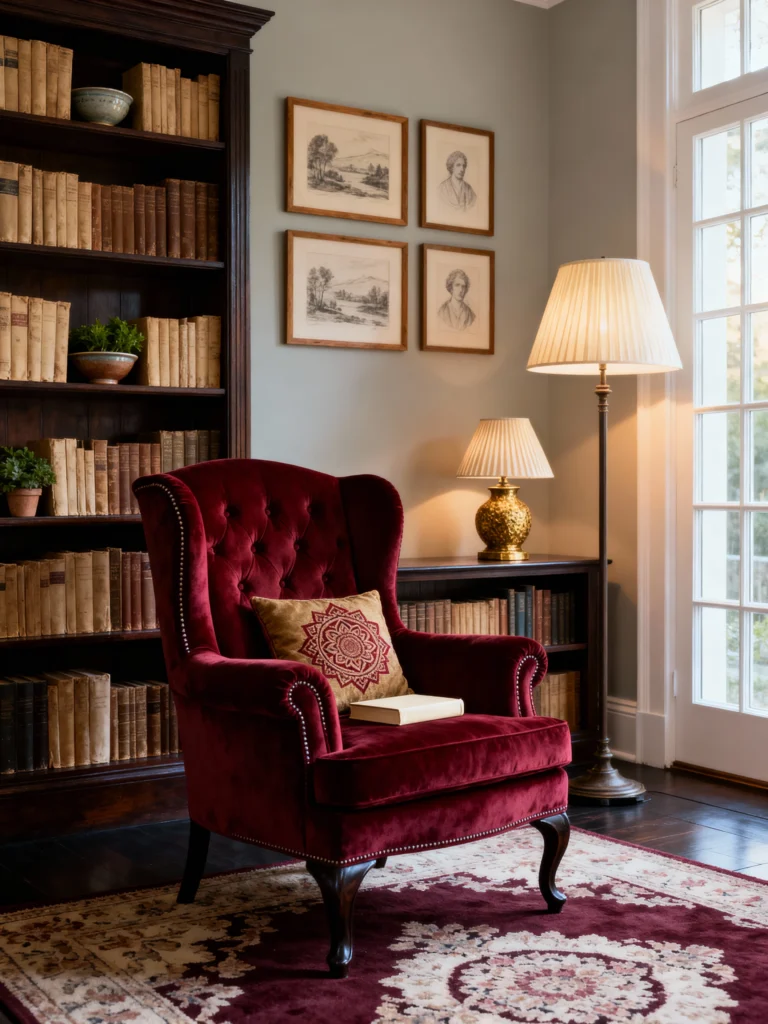 Okay, this one is for the bookworms. That deep burgundy velvet chair is calling my name! It’s such a bold, regal color, but it works because the rest of the room is so grounded with dark wood and aged book spines. This is a great example of “Moody English Country.” The symmetry of the four portraits on the wall gives the eye a place to rest, while the warm glow from the floor lamp makes the whole corner feel intimate. It’s the ultimate “main character” reading nook.