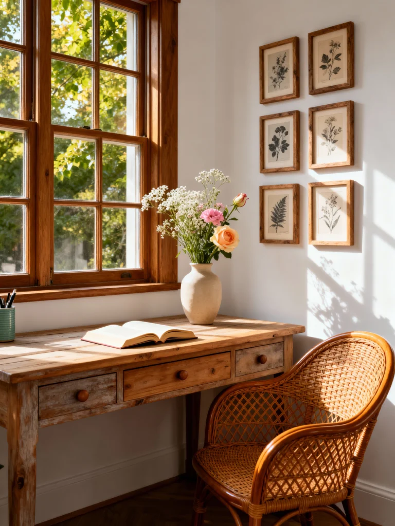 This is simplicity done right. A rustic wooden desk, a comfortable wicker chair, and a view of the trees—what more do you need? I love the “organized chaos” of the botanical prints hung in a grid. It makes the wall feel like a page out of a naturalist’s notebook. The pop of fresh roses and baby’s breath in the simple clay vase adds just enough color to make the room feel alive. It’s a very peaceful, focused space that celebrates the beauty of natural materials like wood and rattan.