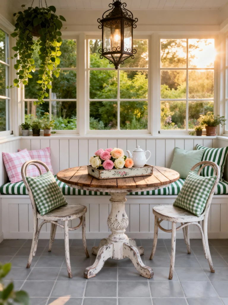 I would never leave this breakfast nook. The wraparound bench seating (or banquette) is so inviting, especially with those mix-and-match pillows. The green-and-white gingham is a classic cottage staple—it’s cheerful and timeless. Hanging a black wrought-iron lantern in the center gives the space a bit of a “secret garden” feel. Plus, having those large windows surrounded by greenery makes it feel like you’re eating brunch right in the middle of a forest. It’s bright, airy, and totally dreamy.