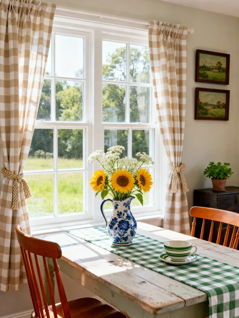 If “cheerful” was a room, it would be this one. The bright yellow sunflowers in the blue-and-white pitcher are such a classic combo. It’s amazing how much a simple fabric choice, like the tan gingham curtains and the green checkered table runner, can change the energy of a room. It feels humble, welcoming, and very “farmhouse kitchen.” This is a look that’s easy to pull off—just find some vintage-style linens and a sturdy wooden table, and you’re halfway there!