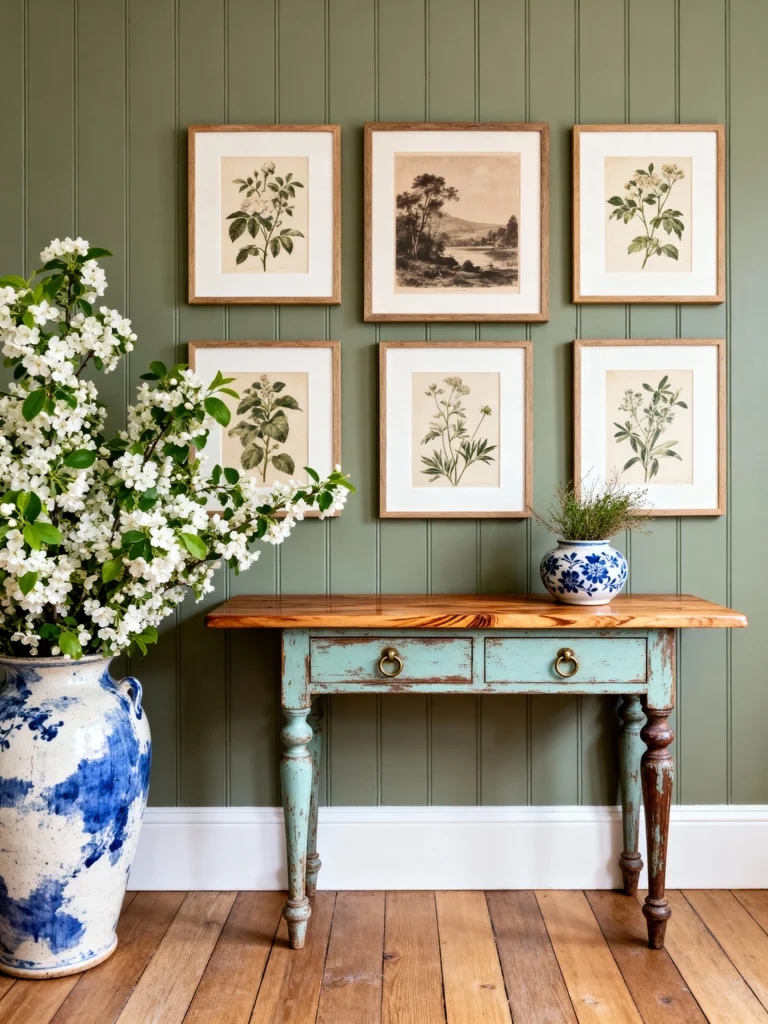 This setup is an absolute masterclass in color palettes. The distressed turquoise desk looks incredible against that olive-green wainscoting. It shouldn’t work, but it does! The large blue-and-white floor vase filled with flowering branches adds a dramatic, organic touch that balances out the structured gallery wall above. Each of those frames features a different plant, turning the wall into a giant piece of art. It’s a great way to fill a hallway or an entryway with a ton of personality.