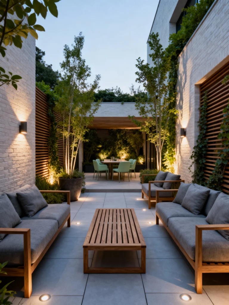 This space is the definition of chic! If your style leans more Modern Minimalist, take notes. The clean lines of the wooden-framed sofas and coffee table, paired with the gray-tiled floor, create a super sophisticated look. What really makes this courtyard special, though, is the lighting. Those uplights and wall sconces cast a warm, ambient glow that highlights the architectural brick walls and the lush, slender trees. It feels totally private and serene, like a secret room hidden away in the city. It’s perfect for intimate conversations or just relaxing after a long day. It’s a masterclass in how to use simple materials and smart lighting to create a high-end feel.