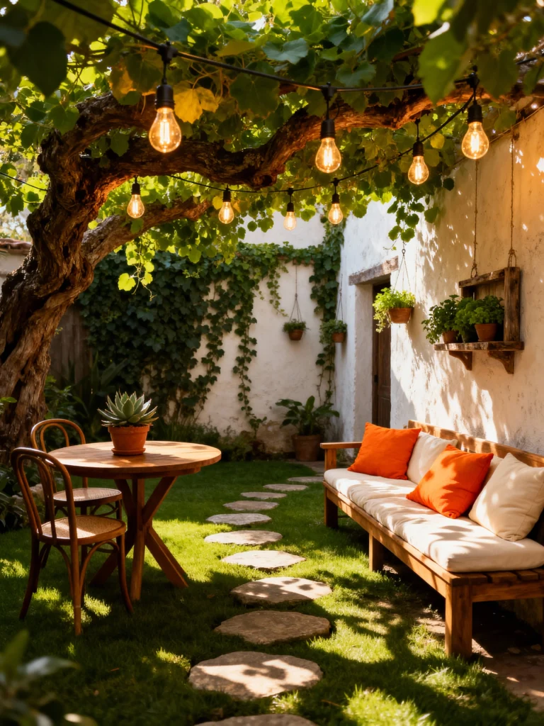 This little nook is absolutely magical, especially with the sun streaming through the leaves! The ancient, twisting Grapevine Canopy creates a natural ceiling, and the string lights with exposed bulbs add a wonderful, rustic ambiance that’s perfect for a summer evening. The wooden bench with the bright orange pillows looks so comfortable, and the small wooden table and chairs are great for a casual meal or craft session. The stepping stones across the grass and the simple white walls with climbing ivy give this spot a cozy, secret-garden feel. It’s a beautiful spot to escape the heat and enjoy a peaceful moment.