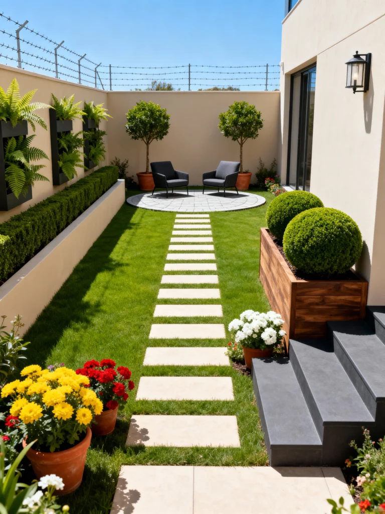 This design proves you don’t need a huge area to make a big impact. The long, narrow lawn is beautifully contrasted by the clean, stepping-stone path leading to a cozy seating area at the back. It’s wonderfully Tidy Escape, with everything in its place. I love the use of potted flowers in vibrant reds and yellows near the steps, adding pops of color against the neutral hardscaping. Notice the tall planters flanking the house wall—that’s a great way to add vertical greenery! This courtyard is all about structure, symmetry, and making the most of a compact, sunny space. It’s an inspiring setup for anyone with a small, linear garden.