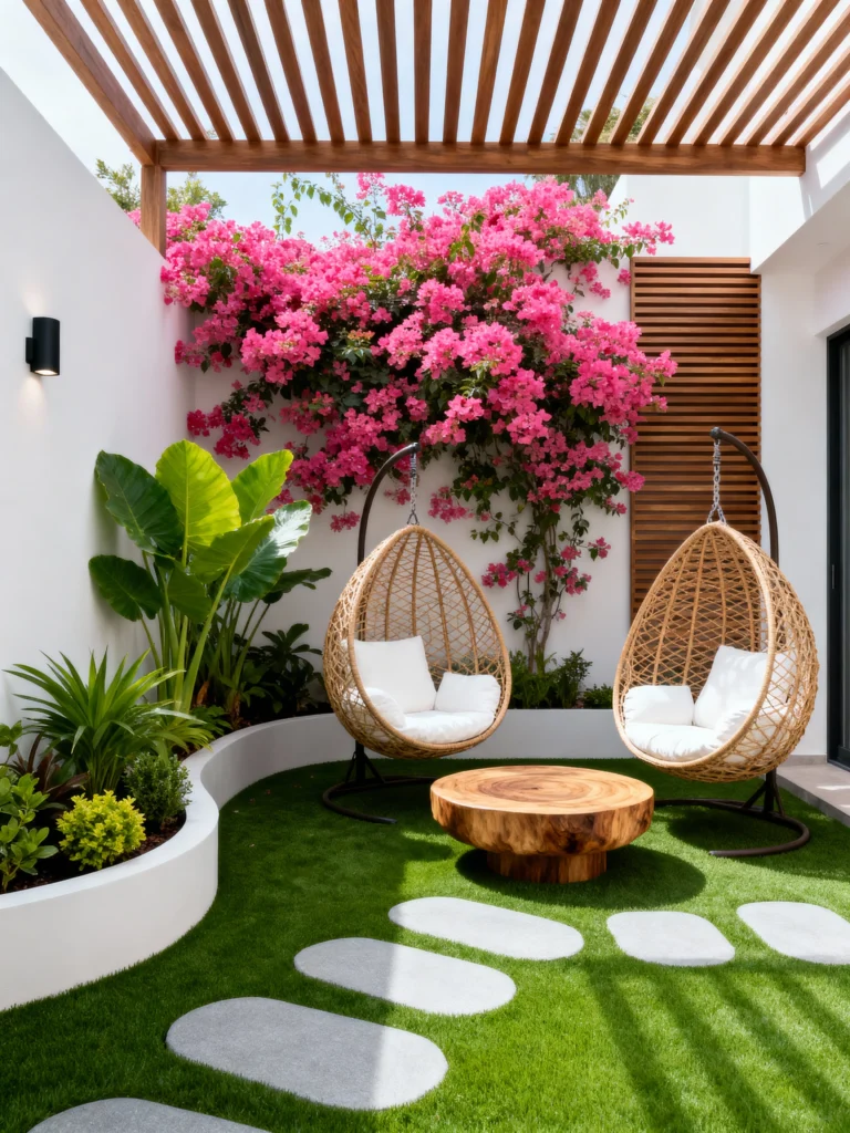 The explosion of bright pink flowers cascading over the white wall is absolutely breathtaking, instantly creating a Tropical Hammocks vibe. This spot is a perfect little sun trap. The artificial turf is a low-maintenance win, and I love the contrast with the smooth, curved stone planter box. The two rattan egg chairs hanging from the wooden pergola look like the most comfortable spot in the world for an afternoon read. The organic wood coffee table adds a beautiful, rustic element. This courtyard feels modern, lush, and incredibly inviting—a true private oasis.