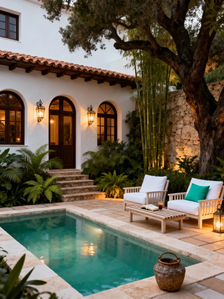This photo transports you straight to the Mediterranean! The terracotta roof tiles, the white stucco walls, and the beautiful arched windows and doors give this space incredible character. It’s the perfect scene for Poolside Arches. The small, deep pool is a dreamy feature, bordered by light travertine stone that extends into the patio. I adore the thick, gnarled tree and the towering bamboo, which add shade and a touch of wildness. With the lanterns casting a soft light on the white chairs and the book resting on the wooden table, it feels like the ultimate, quiet retreat for unwinding after a long day in the sun.