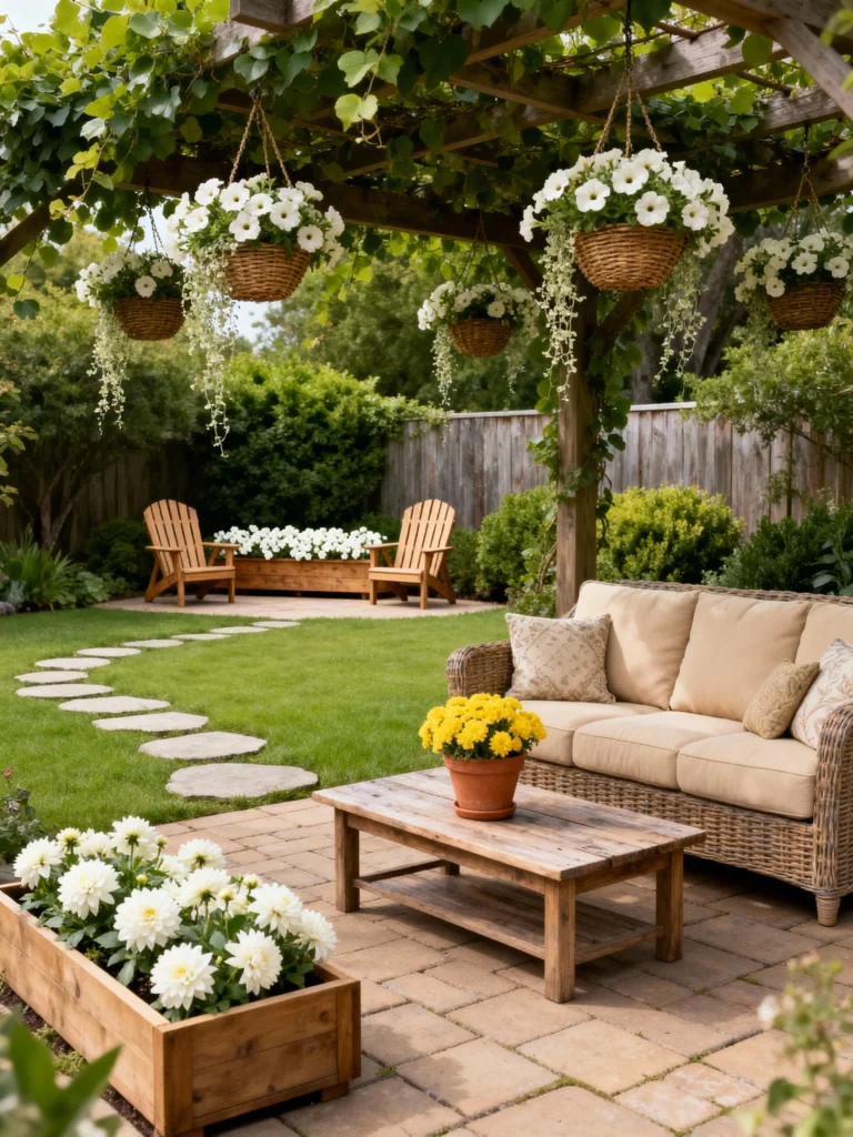 This Rustic Comfort patio is covered by a beautiful wooden pergola draped with vines, offering dappled shade. The hanging baskets filled with white petunias add such a sweet, cottage garden feel. The seating area is perfectly zoned: a comfortable wicker sofa on the stone patio for lounging, and a set of classic Adirondack chairs on the lawn for a quieter spot. The stepping-stone path cutting across the lawn links the two spaces naturally. It’s full of lush greenery and wooden planters, giving it a wonderfully lived-in, relaxed atmosphere—perfect for a weekend brunch.