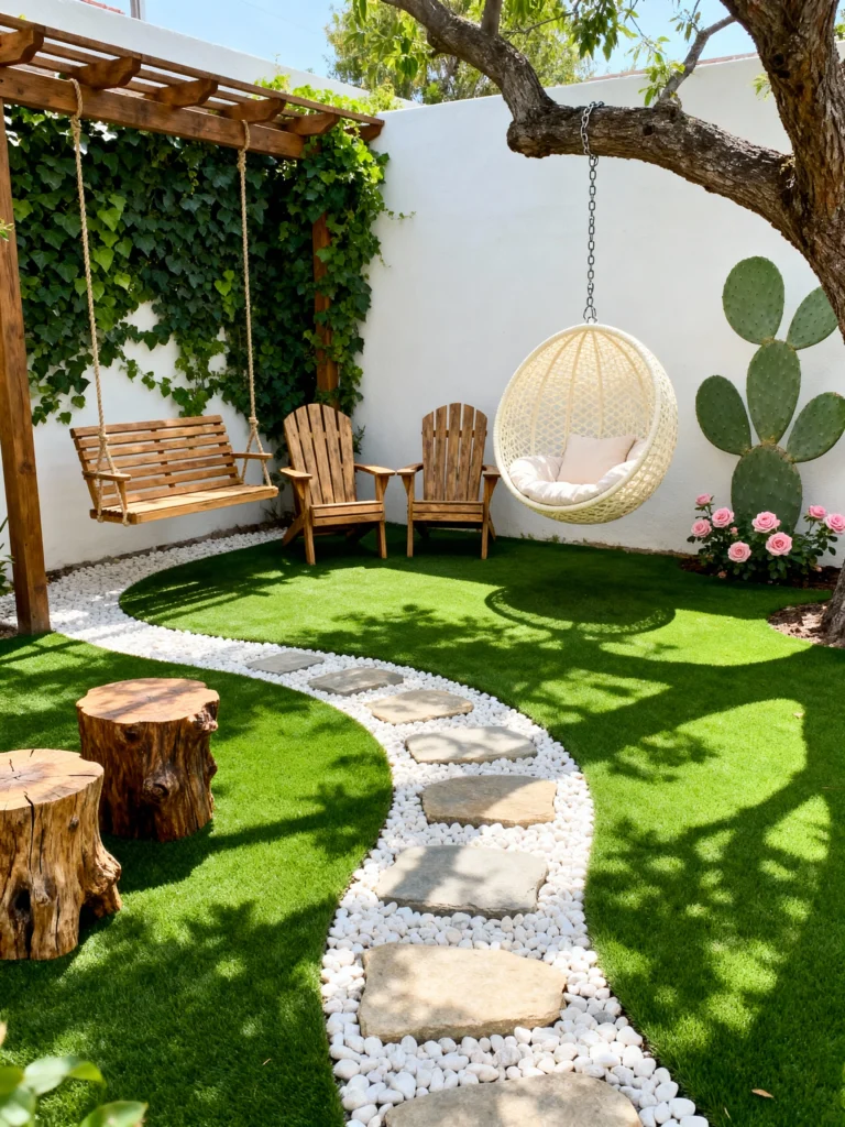 This bright, sunny space has a distinct Desert Charm aesthetic! I love the bold use of contrasting materials: the bright green artificial turf against the striking white pebbles outlining the path. The large, sculptural cactus and the pink roses add a fun, unexpected element against the clean white walls. The various seating options—a classic wooden swing, two Adirondack chairs, and a hanging egg chair—make this a versatile spot for both solo relaxation and enjoying time with a friend. The wooden pergola adds a lovely structural element and a place for the climbing vine. This is a brilliant example of how to create a fun, stylish, and low-water garden.