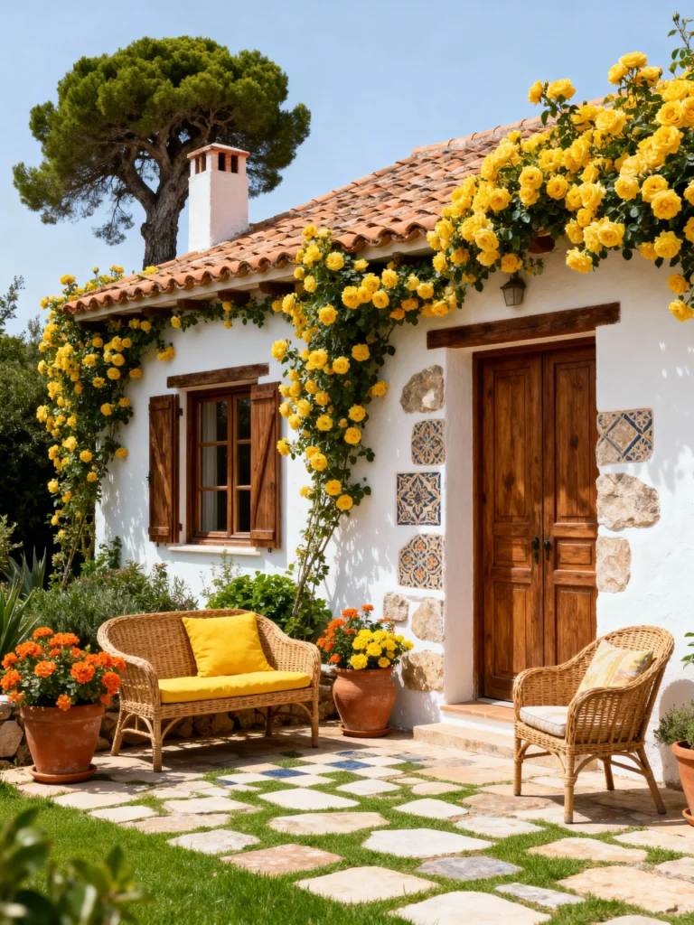 This scene is like a picture postcard! The white-washed villa is draped with stunning Yellow Roses climbing over the roof and around the windows. The pops of color from the orange flowers and the yellow cushions are warm and inviting. The classic terracotta roof and the rustic stone/tile detailing on the wall really lean into that authentic Mediterranean style. The small rattan seating arrangement on the stone patio is the perfect spot to soak up the sun and enjoy a morning coffee. It’s got so much character and charm—a truly happy and picturesque setting.