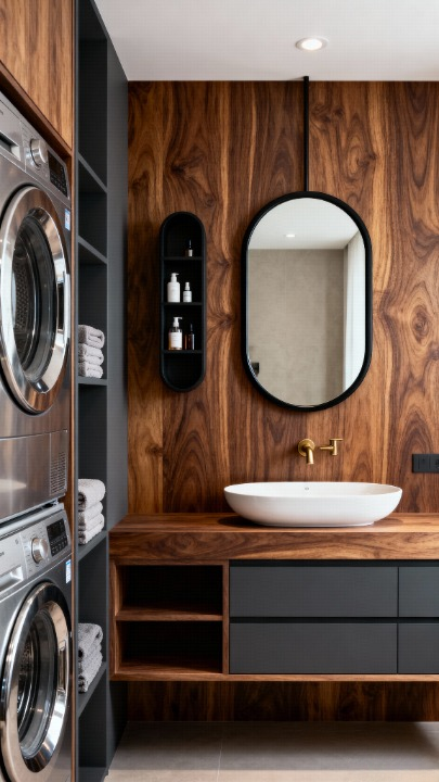 Even the laundry area can be stylish! This space integrates a washer/dryer stack seamlessly next to floor-to-ceiling shelving. The wall is covered in a beautiful, high-contrast wood veneer with a stunning natural grain. The dark grey cabinetry below the sink creates a clean, modern base, while the oval mirror and minimal brass hardware add a final touch of sophistication.