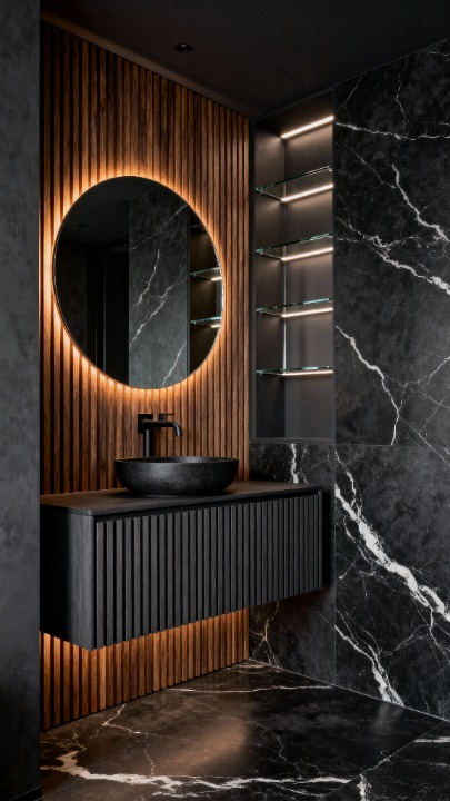 This is pure, sophisticated luxury! The walls and floor are clad in dramatic black marble with crisp white veining, creating a stunning, high-contrast look. Warm LED strips illuminate a slatted wood panel accent wall and the under-mount of the black slatted vanity. The round, backlit mirror and dark vessel sink complete this sleek, modern aesthetic. It’s a chic and incredibly moody space.