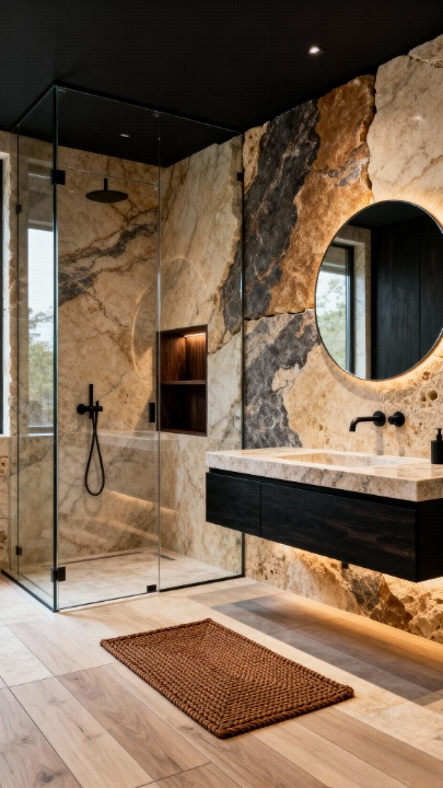 Talk about drama! This bathroom uses large-format natural stone with incredible marbling in warm browns, blacks, and creams as a striking feature wall. The black floating vanity and fixtures offer a sharp, modern contrast, while the perimeter lighting underneath makes it feel like the vanity is effortlessly suspended. The whole space is grounded by the warm, wide-plank wood flooring, making this a luxurious, spa-like experience.