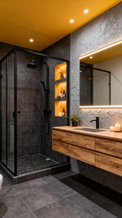 Who says a moody bathroom can’t have fun? The dark grey, textured walls and black-framed shower set a serious, modern tone, but that bright yellow ceiling injects a vibrant, unexpected pop of color! The floating wooden vanity with its natural grain adds warmth, while the tiered, illuminated niche shelving provides a cozy glow. It’s a bold look that really pays off in personality.