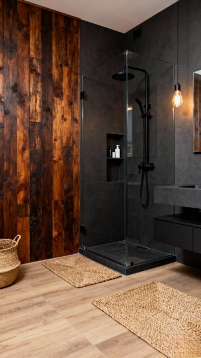 This design is all about contrast and texture. The dark, vertical wood paneling brings a deep, rustic warmth to one wall, beautifully offsetting the dark, textured grey tiles in the shower area. The simple black shower fixtures and clean glass enclosure keep the focus on the materials. Jute mats and the wooden basket add a cozy, natural touch, balancing the moody, dark palette perfectly.