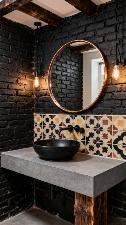 This bathroom mixes rugged and refined elements perfectly. The black-painted exposed brick walls give a raw, textural backdrop. Beneath the concrete vanity, a vibrant strip of patterned, vintage-look tiles adds a splash of color and personality. A copper-framed mirror and exposed bulb pendants introduce a soft, metallic warmth to this otherwise dark, rustic setting.